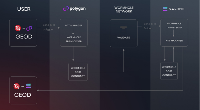 Below is a diagram showing the bridge process from GEOD on Polygon to GEOD on Solana.