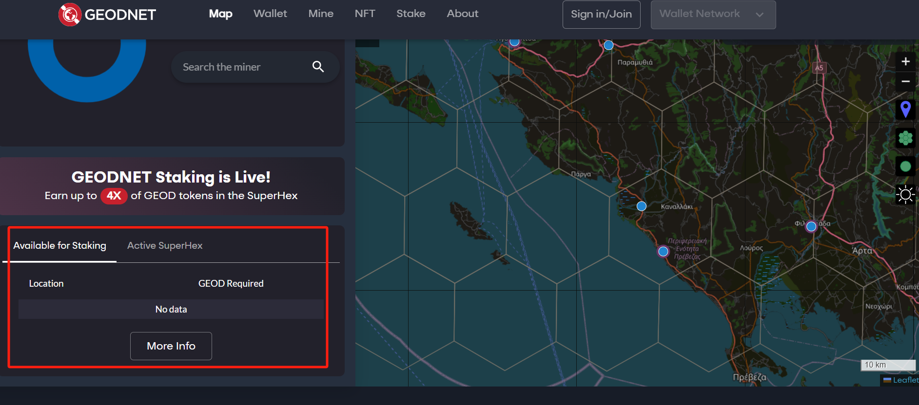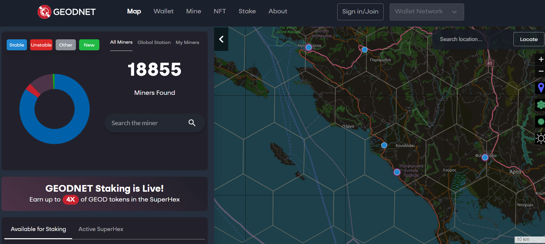 Click the “Available for Staking” button to view the list of locations available for staking. Click the “Active SuperHex" button to view the list of Active SuperHexes.<br>